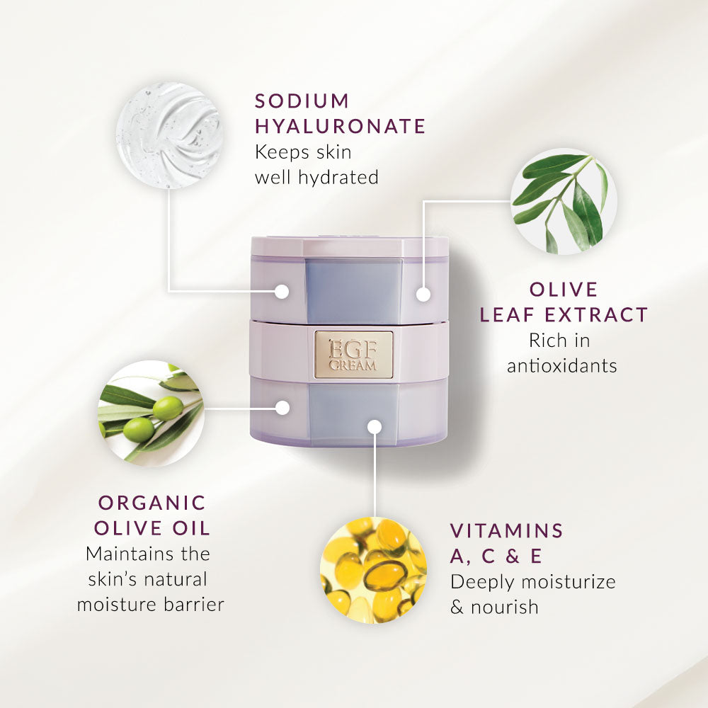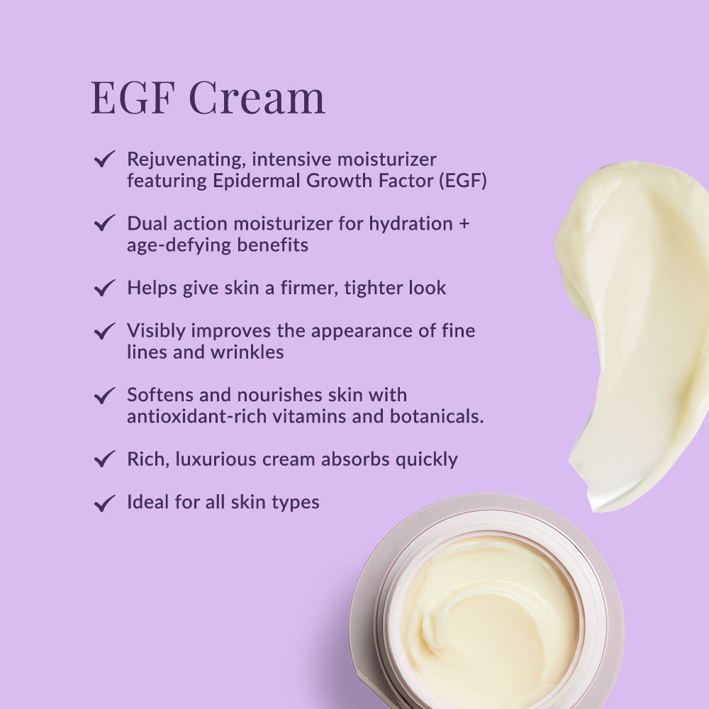 This is an intensive moisturizer with additional age-defying benefits. Featuring epidermal growth factor (EGF), a naturally occurring peptide in the body that helps give the skin a tighter, firmer look. This skin-rejuvenating formula can help improve the appearance of fine lines and wrinkles while maintaining hydration. Also included is hydrolyzed collagen for soft, supple, firmer-looking skin.
