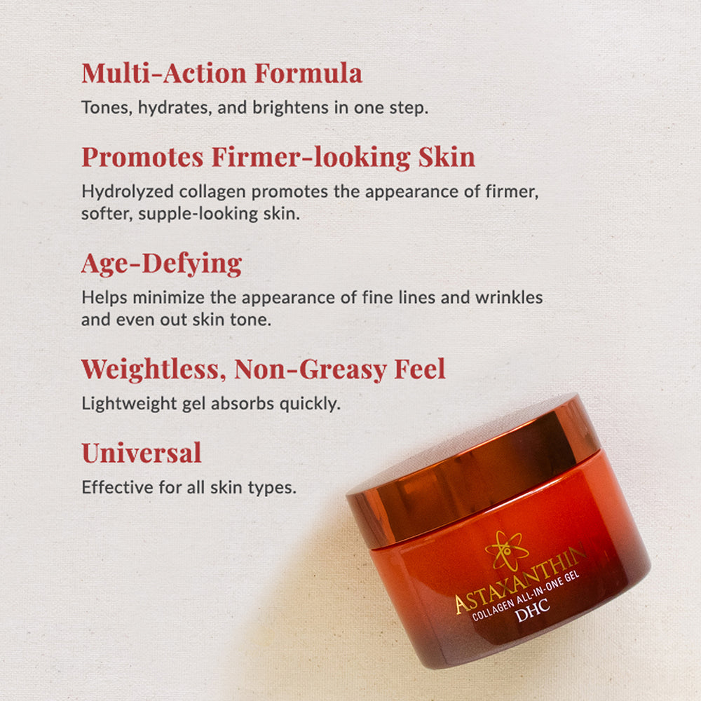 - Astaxanthin Collagen All-In-One Gel is a daily facial moisturizer that tones, hydrates, and brightens skin in one simple step. It also gives a boost of antioxidant protection to your skincare routine.