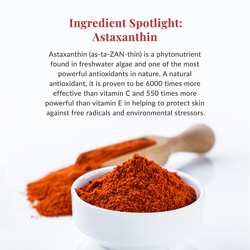 It harnesses the power of astaxanthin, a natural antioxidant proven to be 6,000 times more effective than vitamin C and 550 times more powerful than vitamin E in helping to protect against free radicals and environmental stressors.